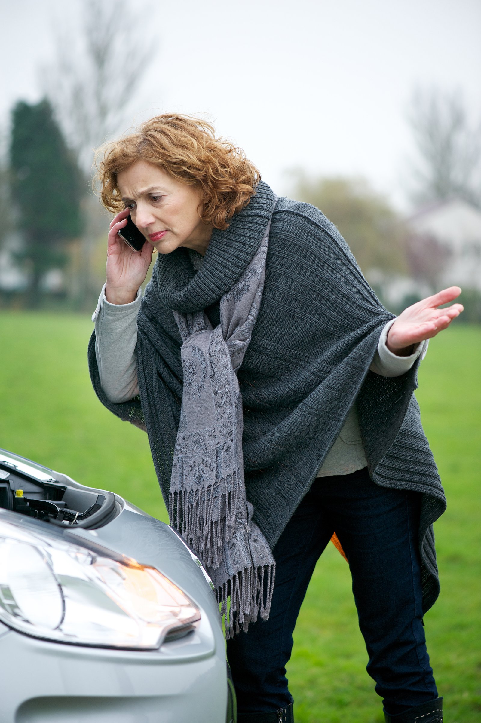 Caucasian woman on the mobile phone outdoors and communicating with automobile customer service department